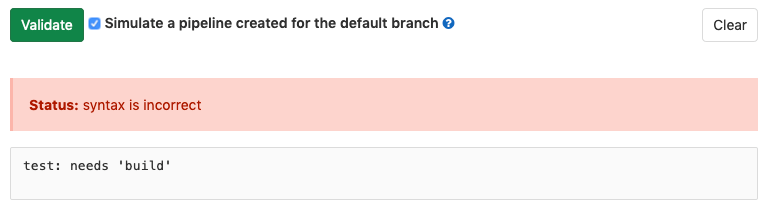 If you want to test the validity of your GitLab CI/CD configuration before committing the changes, you can use the CI Lint tool. This tool checks for syntax and logical errors by default, and can simulate pipeline creation to try to find more complicated issues as well.