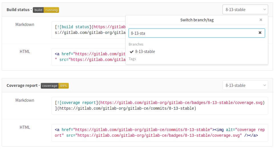 In the pipelines settings page you can find pipeline status and test coverage badges for your project. The latest successful pipeline is used to read the pipeline status and test coverage values.