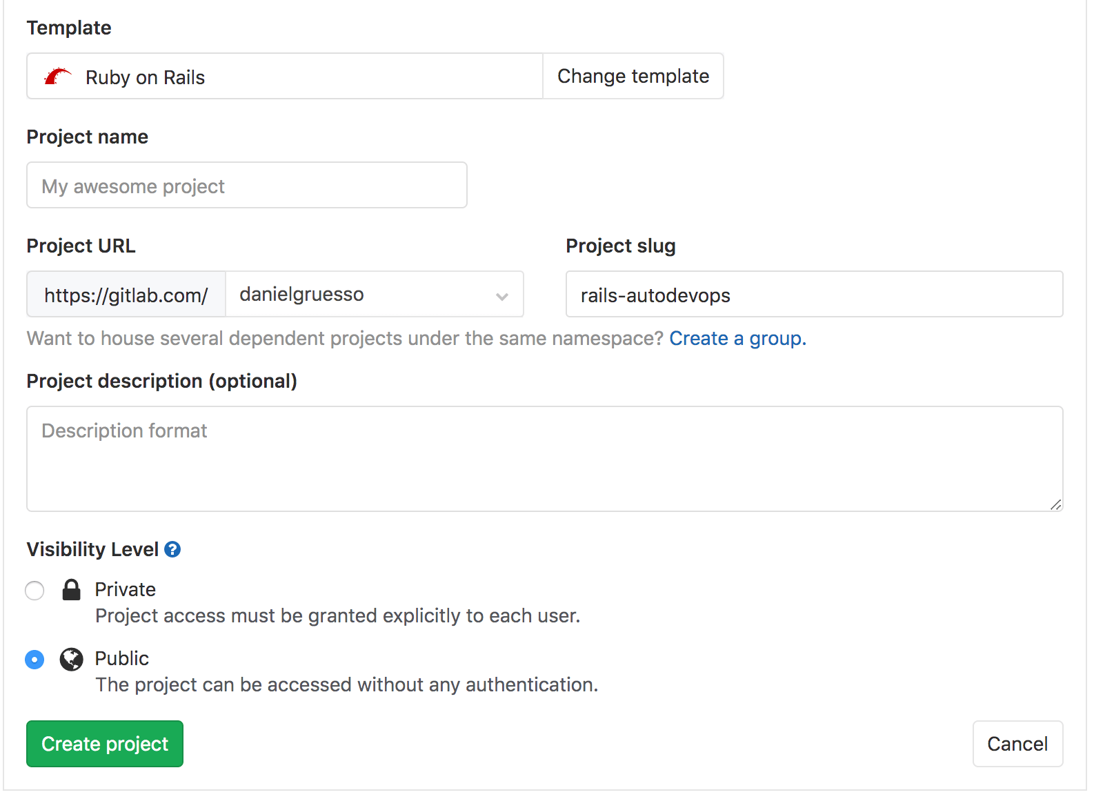 Give your project a name, optionally a description, and make it public so that you can take advantage of the features available in the GitLab Ultimate plan.