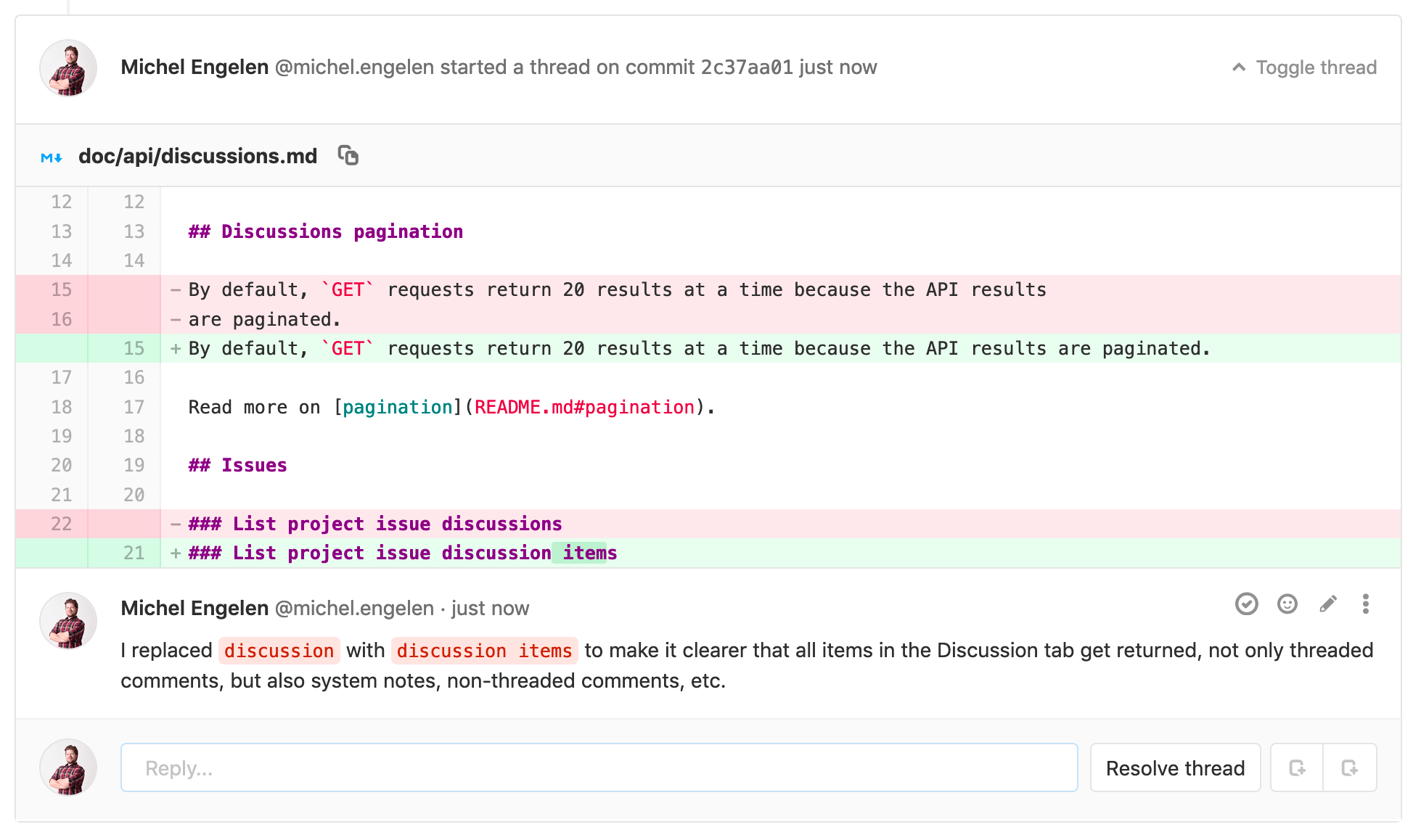 3. Any threads created this way are shown in the merge request's Discussions tab and are resolvable.