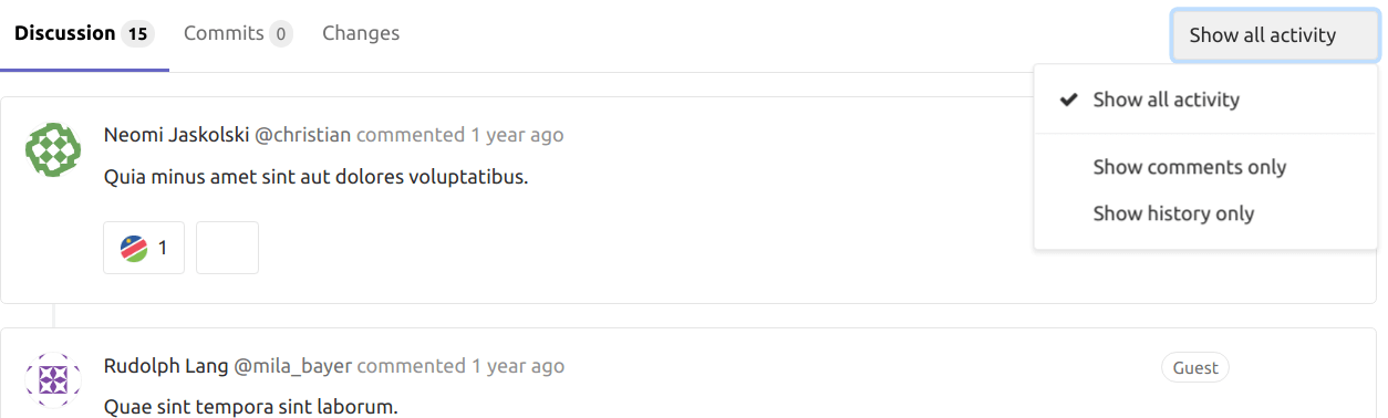 • Show all activity: displays all user comments and system notes (issue updates, mentions from other issues, changes to the description, etc).