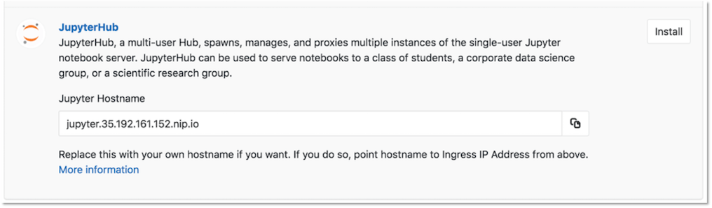 3. After Ingress has been installed successfully, click the Install button next to the JupyterHub application. You need the Jupyter Hostname provided here in the next step.