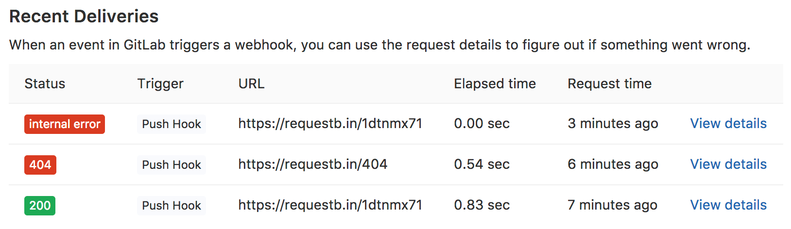 To view more information about the request's execution, click the respective View details link. On the details page, you can see the request headers and body sent and received by GitLab.