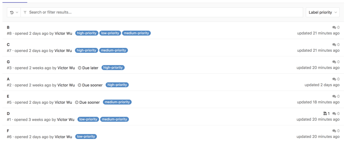 - Priority sorting is based on the highest priority label only. This discussion considers changing this.