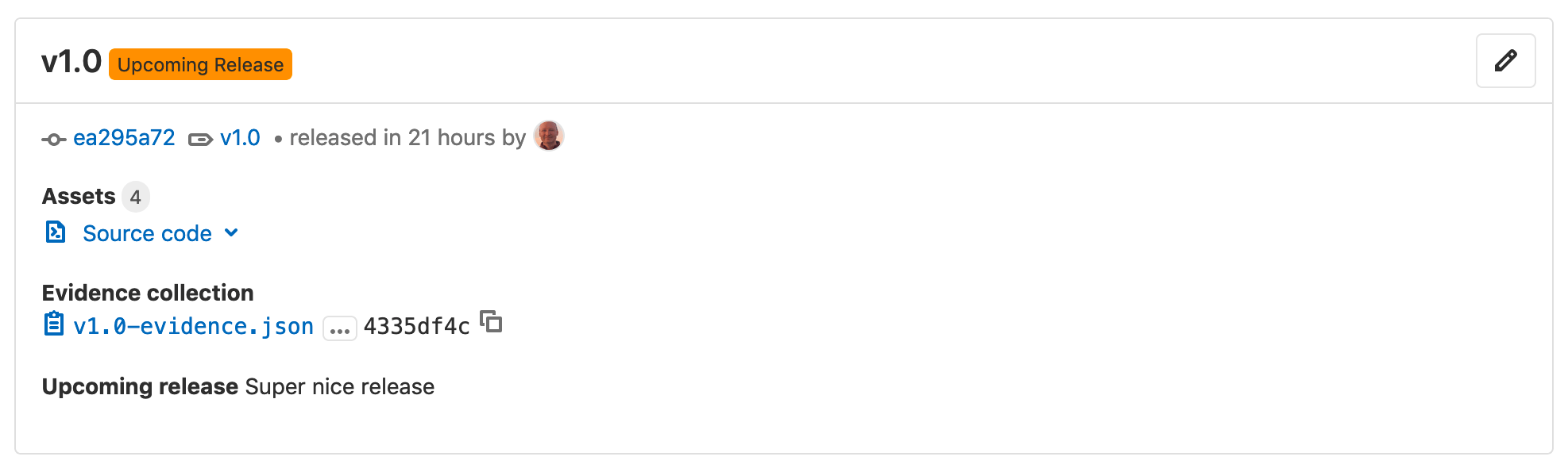 You can also use the API to generate release evidence for an existing release. Because of this, each release can have multiple release evidence snapshots. You can view the release evidence and its details on the Releases page.