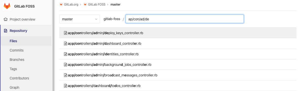 The file finder feature allows you to search for a file in a repository using the GitLab UI. To use it: