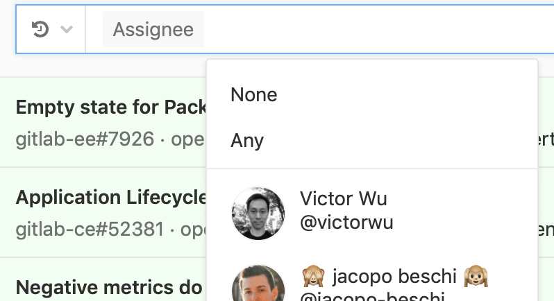 GitLab provides many filters across many pages (issues, merge requests, epics, and pipelines among others) which you can use to narrow down your search. When using the filter functionality, you can start typing characters to bring up relevant users or other attributes.
